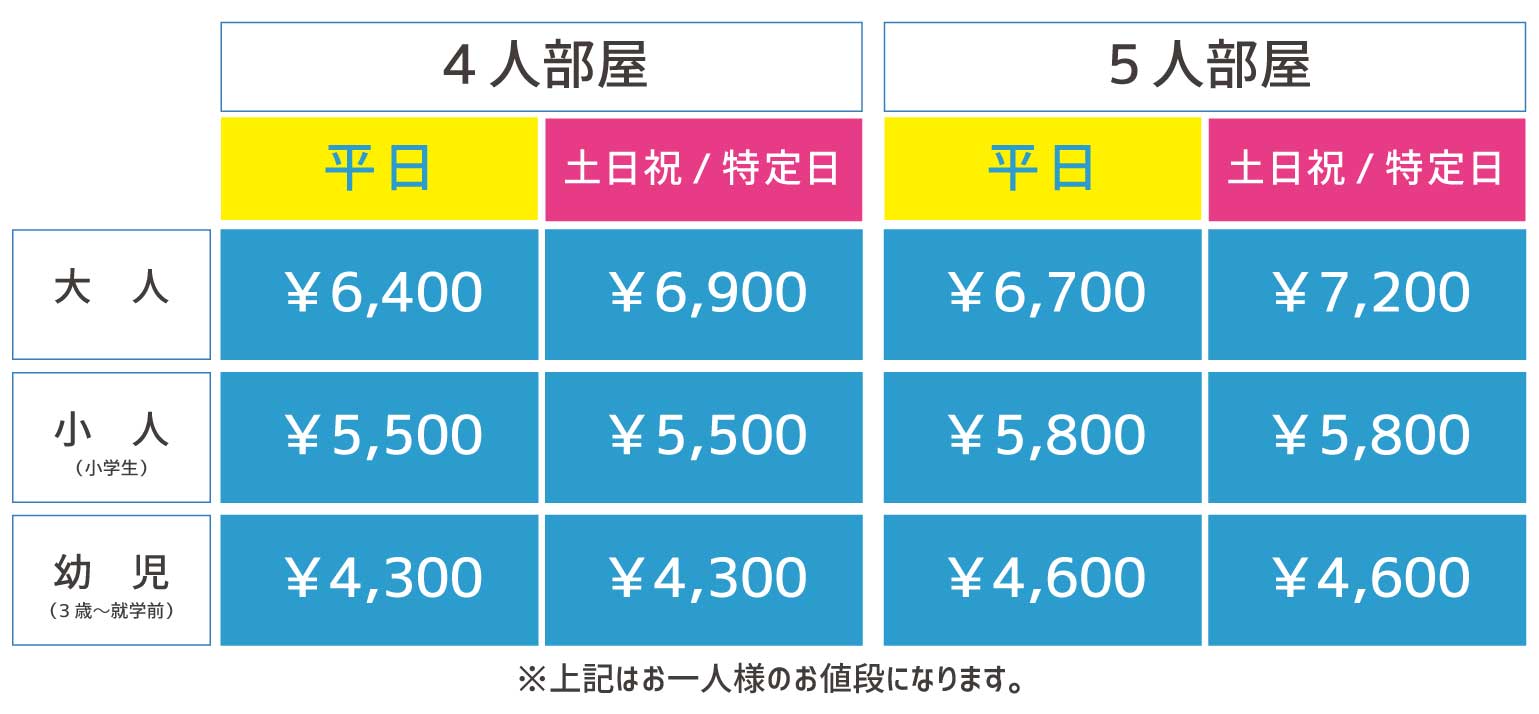 上記は入館料+深夜料金+お部屋代を合わせた金額になります。