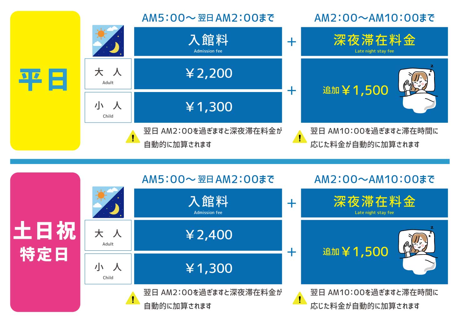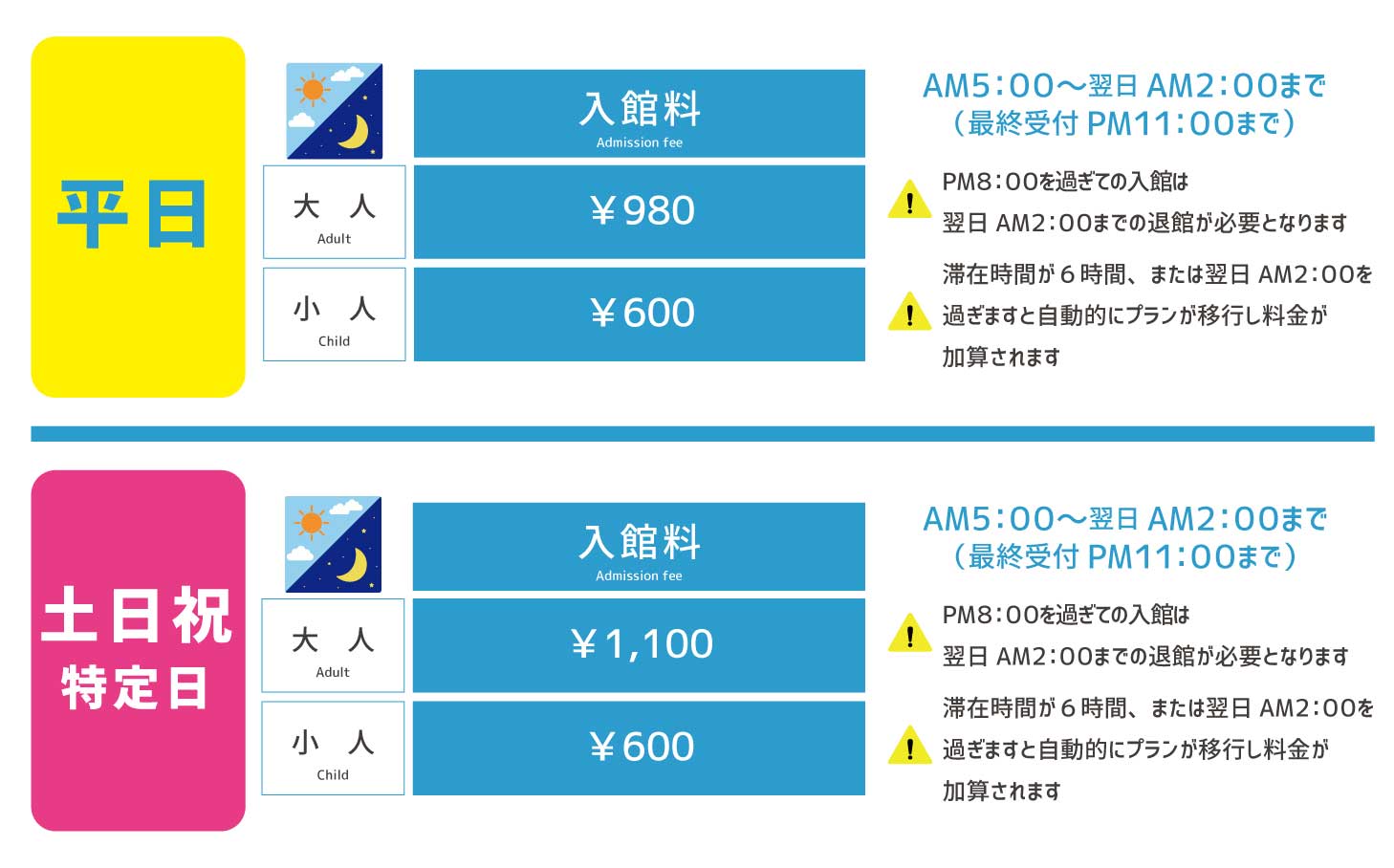 ※6時間プランは午後8:00を過ぎての入館は翌日深夜2:00までの退館が必要となります。