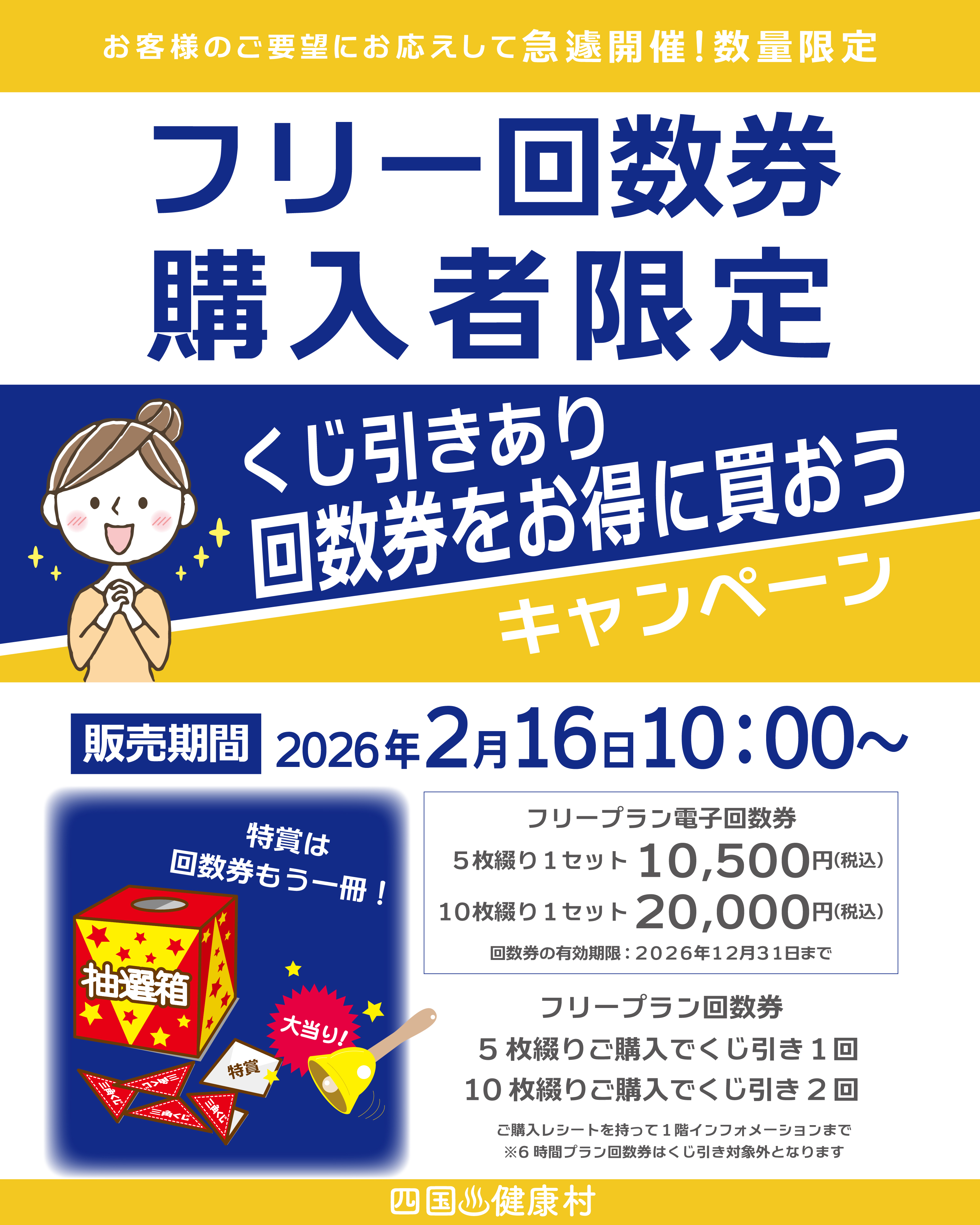 フリープラン回数券ご購入で5枚綴り毎にくじ引き1回挑戦出来ます♪